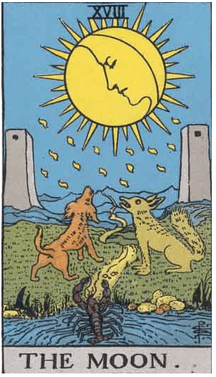 後突然頓悟走靈性,雖然他們還是有被神明點醒並開悟,可是通常他們的腦海裡會出現很多幻象,比如前世今生或是我應該要做什麼,老師只能說這些事情都存在,但是他們會誇大,想像時會扭曲,因為是內在經驗反映到外在心靈,所以他不完全是種神訊,不完全是種靈性,有些是內在潛意識反射到的,比如說有部分是我希望自己是這樣,又有部分是真的有能力,所以一些是超意識一些還是自我慾望,每個人都是獨一無二,都是不平凡的,但是否為大家理解的就是要持以問號了,這時要問不平凡想幹嘛,所以月亮牌會有一半慾望一半神訊,會被折射出來,把內在陰影反饋在現實層面,原我的狂野浮上表面,這力量會帶出身上某種原始非人的東西。