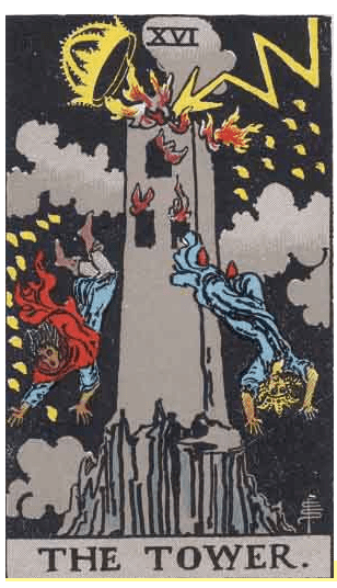 正位時意味著劇烈動亂時期(心理或實際)長期穩固局面崩塌,不要讓現在局面繼續惡化,暴力中的決裂關係,如果是問兩人關係的話,可能在三個月關係一定會改變,當然一定把不是自己想像的方向去改變,不管合作或情侶關係,越是怕會不會被背叛、會不會分道揚鑣,希望像以前一樣好,越是有這些想法越是往內心發展的,因為關係之間的問題已經不是一天兩天造成的了,課題的爆發,這也很常出現與家人課題裡,例如說媽媽特別給哥哥東西,對你來說晴天霹靂,媽媽果然偏心,再也不相信媽媽,心裡已經是做高塔已經見到真相,這時候就該去面對,先理解自己然後在化解,搭配其他卡牌就可以知道接下來要怎麼做。